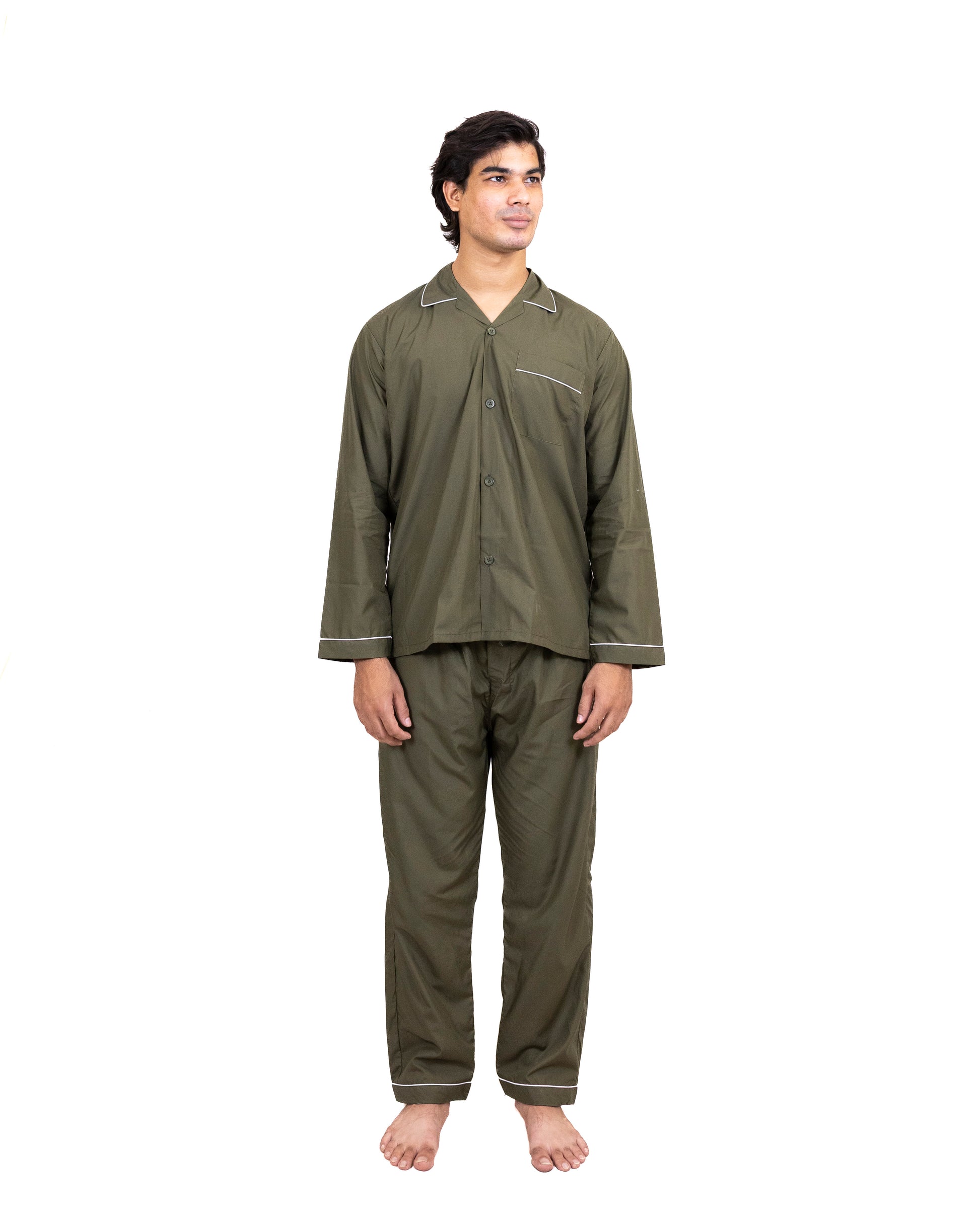 Crafted from 100% pure cotton, this two-piece set features a full-sleeved shirt with a front patch pocket and contrast piping, paired with a pajama designed for ease—complete with an elastic waistband, and button-fly closure.