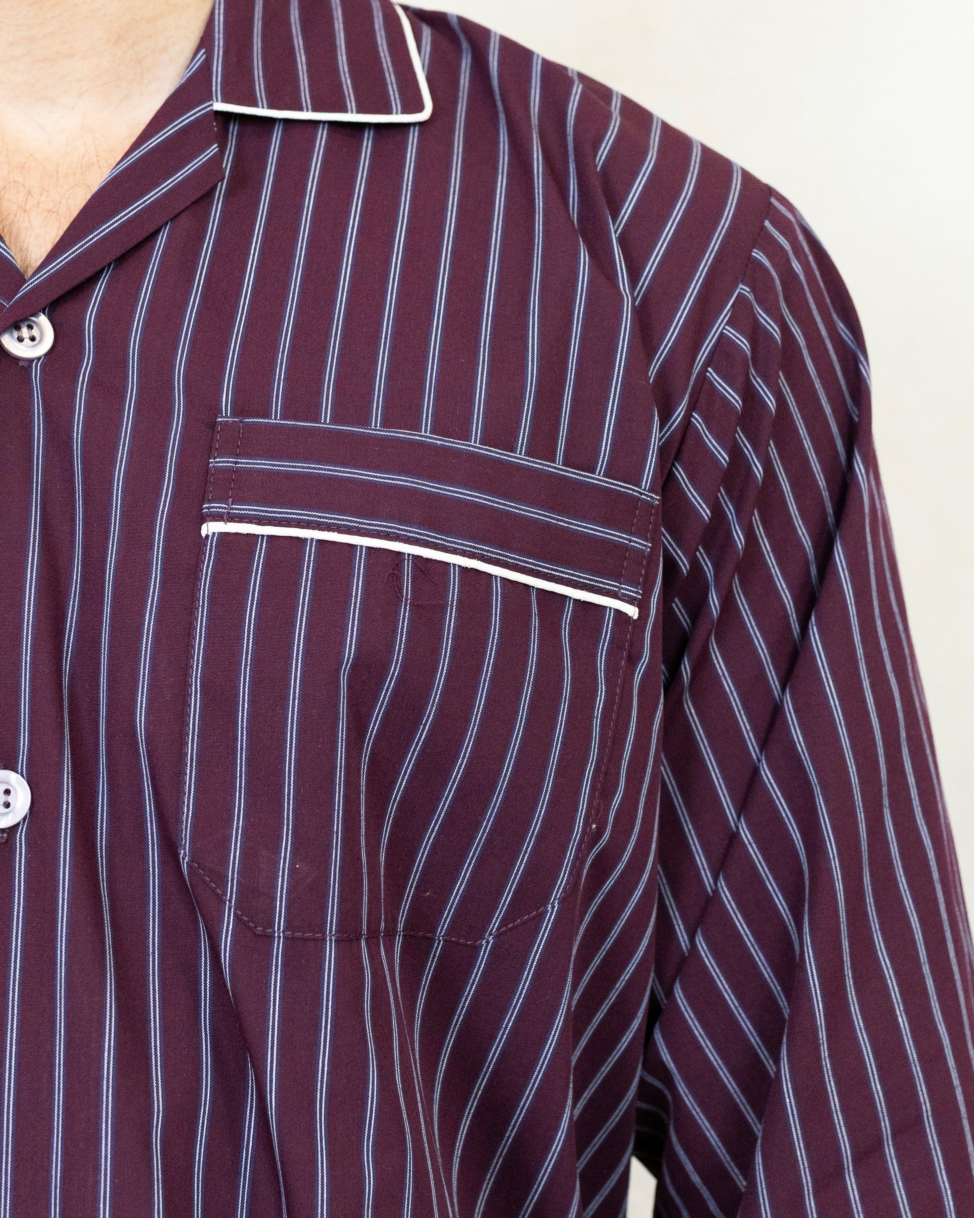 Crafted from 100% pure cotton, this two-piece set features a full-sleeved shirt with a front patch pocket and contrast piping, paired with a pajama designed for ease—complete with an elastic waistband, and button-fly closure.
